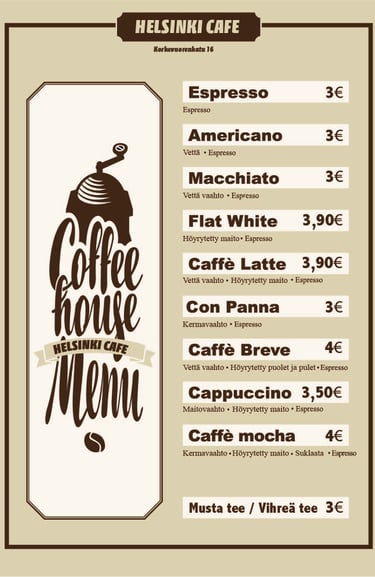 Menu ei ole vain hinnasto – se on yrityksesi tärkein myyjä. Suunnittelemme visuaalisesti selkeät ja myyntipsykologiaan perustuvat menut, jotka ohjaavat asiakkaasi valitsemaan juuri ne tuotteet, joita haluat korostaa.