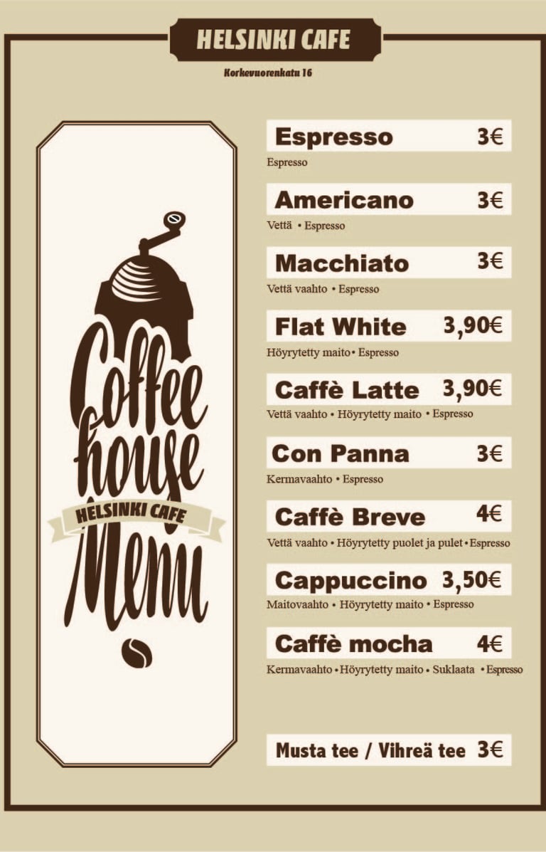 Tarjoamme menut ravintoloille, kahviloille, baareille ja pikaruokapaikoille: painetut menut, digitaaliset TV‑menut, pöytäkortit, takeaway‑menut ja kampanjalistat. Yhtenäinen brändi, selkeä rakenne ja houkutteleva visuaalinen ilme lisäävät myyntiä heti.